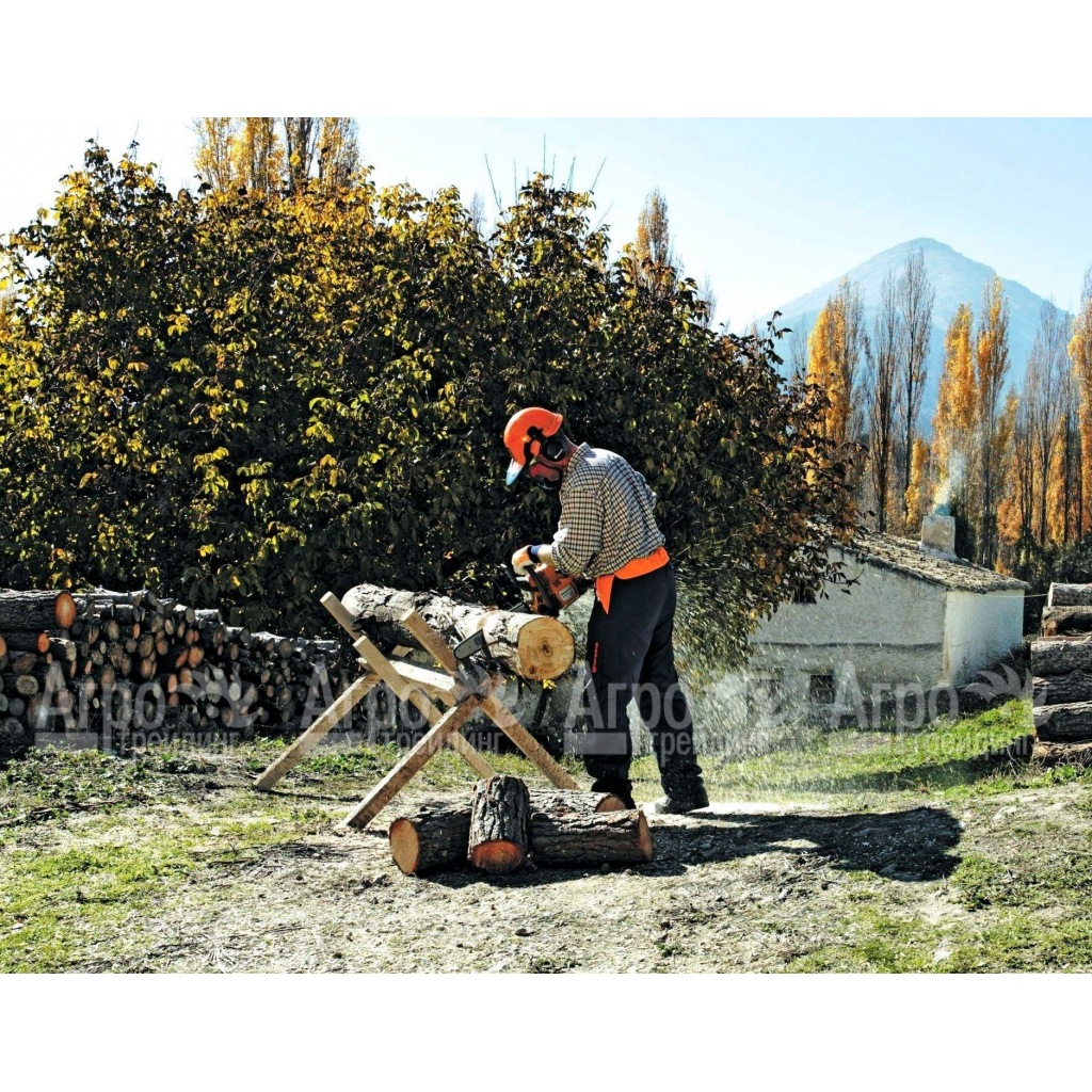 Натяжение цепи осуществляется без применения дополнительных инструментов. В случае соскальзывания или при застревании шины в древесине автоматически срабатывает защитный механизм, который приостанавливает работу агрегата. Эргономическая рукоятка с прорезиненными вставками снижает нагрузку на руки оператора. Благодаря наличию дополнительной ручки можно точно контролировать весь процесс эксплуатации. Специальный щит, расположенный над режущим полотном, препятствует контакту рук с острой шиной.