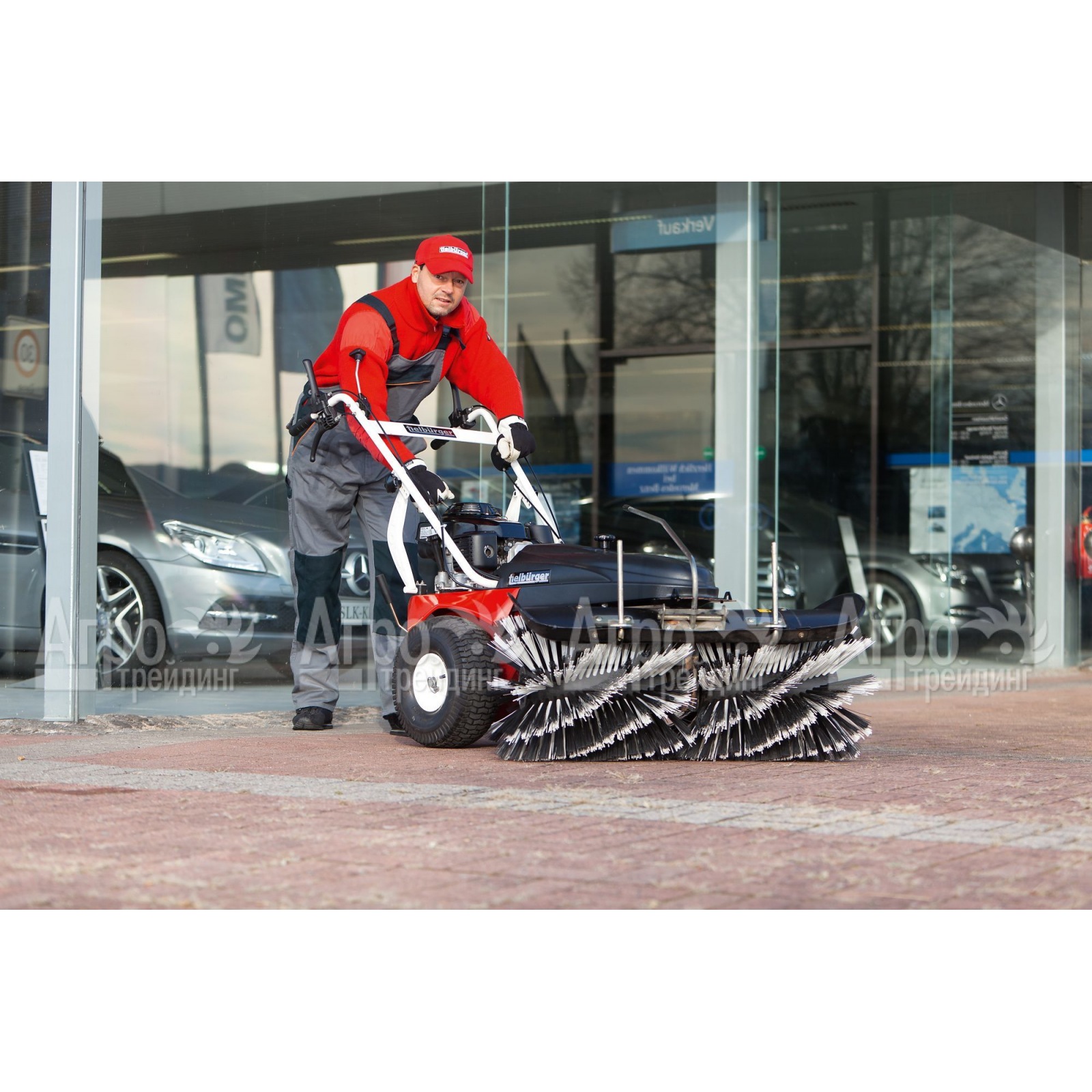 Универсальный механизм регулировки положения щетки позволяет установить оптимальное направление выметания мусора, увеличивать или уменьшать давление щетки к очищаемой поверхности. Есть возможность регулировки скорости вращения щетки. Производитель предоставляет пользователям большой выбор навесного оборудования, что делает технику многофункциональной: снегоуборочный нож - отвал; щетка для снега; универсальная щетка для мусора; цепи на колеса; накопительный контейнер; разбрызгиватель воды; защитный фартук.